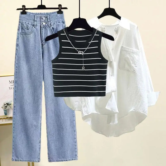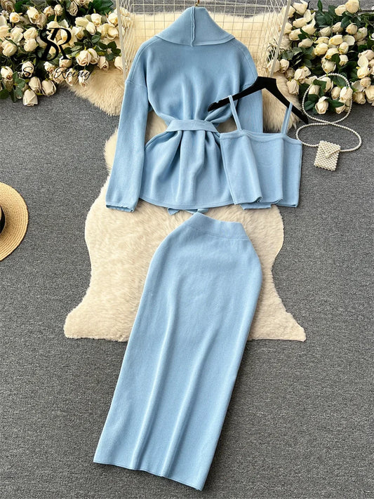 "Chic Women's 3-Piece Set: Stylish Outerwear, Top & Skirt Ensemble"