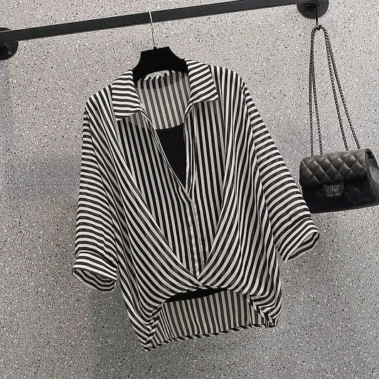 "Chic Chiffon Striped Shirt with Slim Fit Flare Pants"